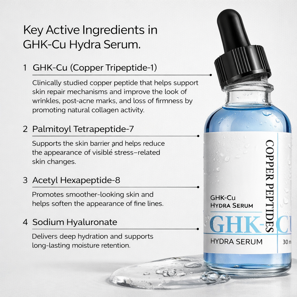 Unlike products that temporarily mask signs of aging, GHK-Cu works at the signaling level of your skin. It supports natural regenerative pathways linked to collagen activity, repair, and hydration balance.